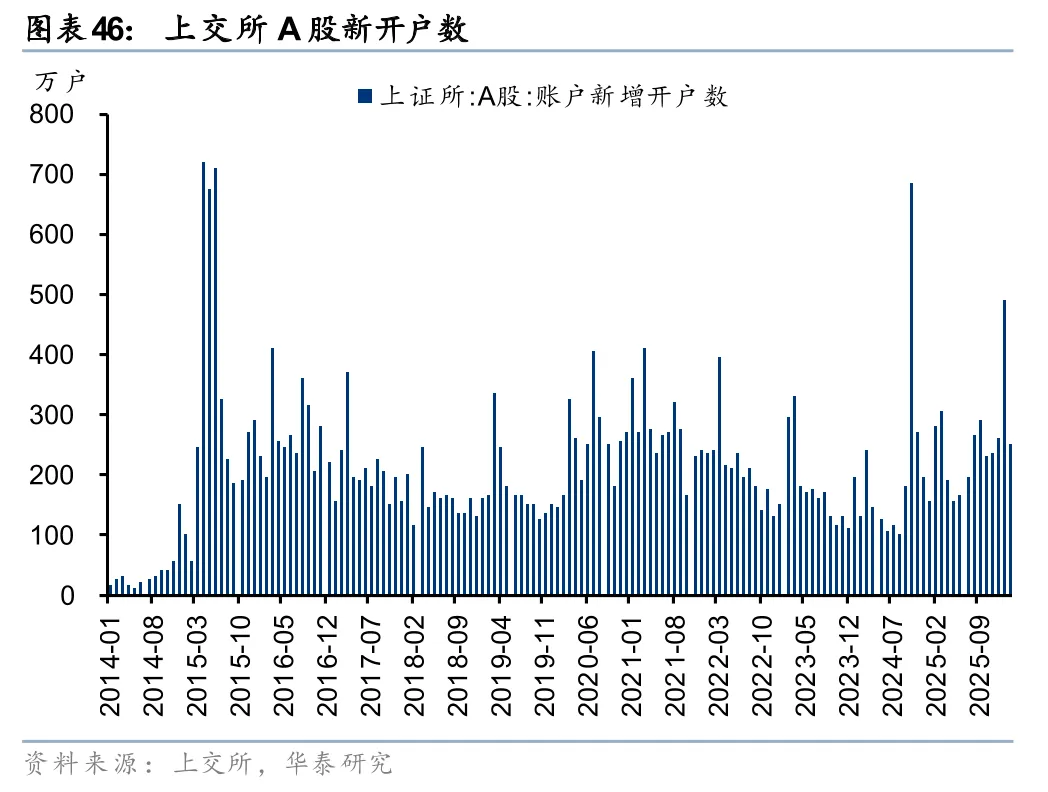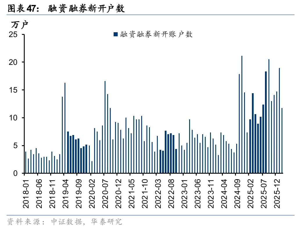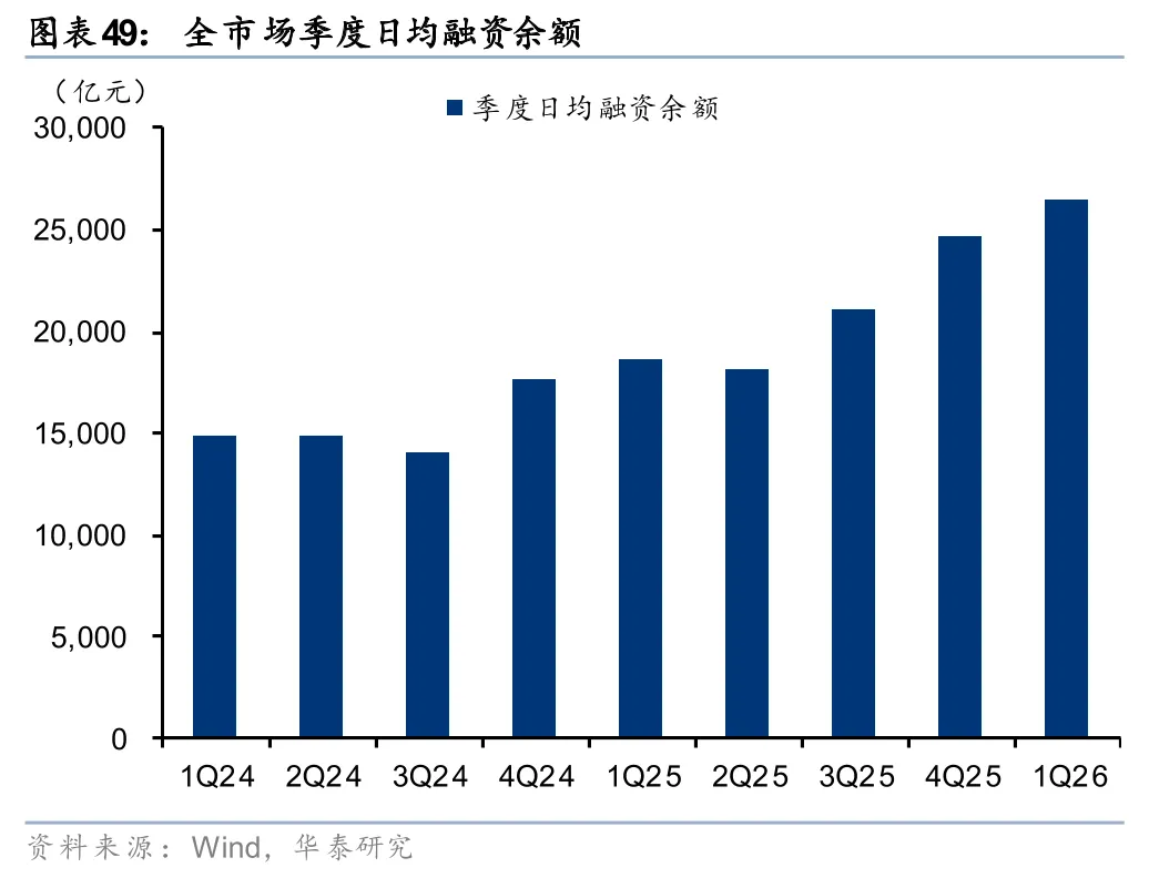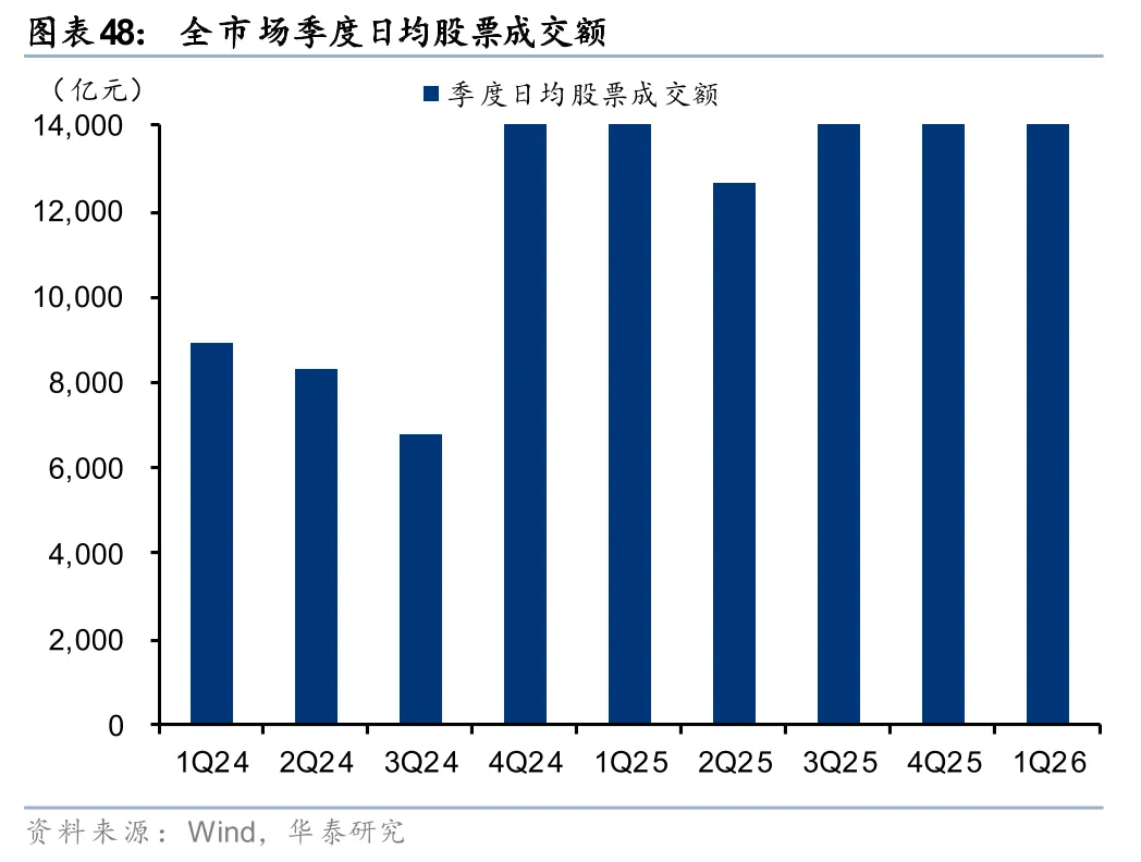 新开户保持活跃,交投活跃度有望延续,大财富业务趋势上行。2026年以来A股和两融单月新开户数仍保持较高水平,尤其1月环比增长明显。据上交所和中证数据披露,2026年1月A股和融资融券新开户数分别为492万户、19.0万户,同比+213%、+157%,环比+89%、+30%,2月虽有回落但仍处于较高水平。且年初以来A股交易活跃,Q1日均成交额25,805 亿元,同比+69%。我们预计2万亿日成交额有望成为常态,大财富业务趋势上行。