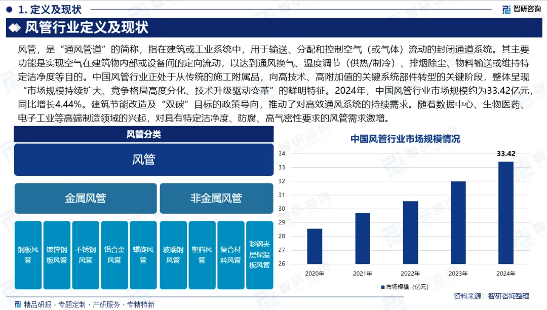 风管,是“通风管道”的简称,指在建筑或工业系统中,用于输送、分配和控制空气(或气体)流动的封闭通道系统。其主要功能是实现空气在建筑物内部或设备间的定向流动,以达到通风换气、温度调节(供热/制冷)、排烟除尘、物料输送或维持特定洁净度等目的。按材质分类,风管主要分为金属风管和非金属风管两大类。2024年,中国风管行业市场规模33.42亿元,同比增4.44%。未来,行业将向多功能集成部件演进,材料技术突破(如生物基材料、高性能聚合物)与数字化生产(BIM预制化、数字孪生运维)成核心方向,同时下游产业升级催生特种风管需求,企业需转型为“深度场景解决方案提供商”以应对专业化、非标化挑战。