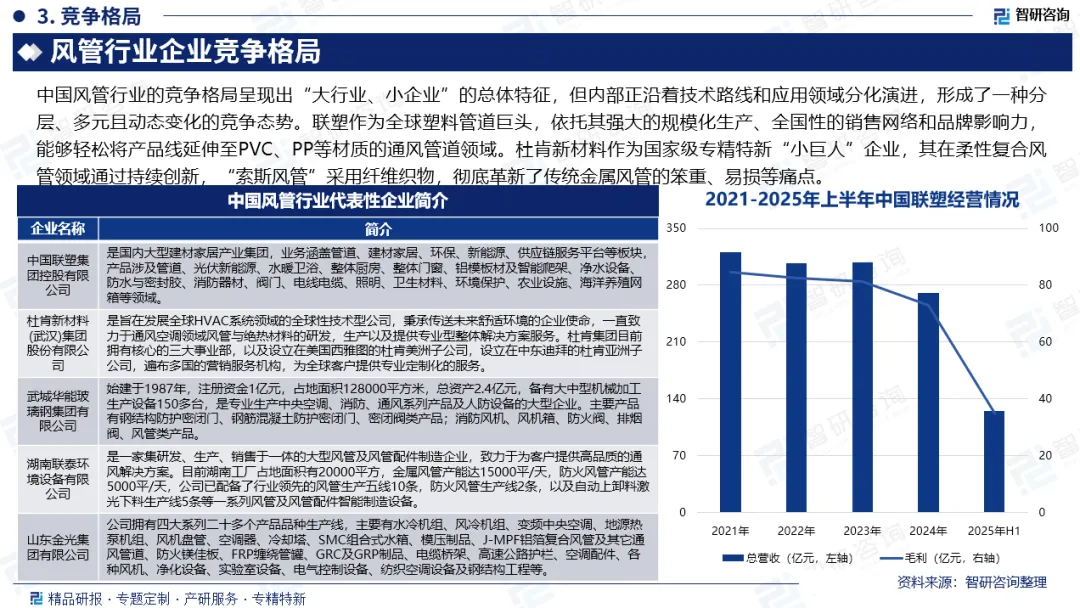 竞争情况:中国风管行业的竞争格局呈现出“大行业、小企业”的总体特征,但内部正沿着技术路线和应用领域分化演进,形成了一种分层、多元且动态变化的竞争态势。联塑作为全球塑料管道巨头,依托其强大的规模化生产、全国性的销售网络和品牌影响力,能够轻松将产品线延伸至PVC、PP等材质的通风管道领域。杜肯新材料作为国家级专精特新“小巨人”企业,其在柔性复合风管领域通过持续创新,“索斯风管”采用纤维织物,彻底革新了传统金属风管的笨重、易损等痛点。