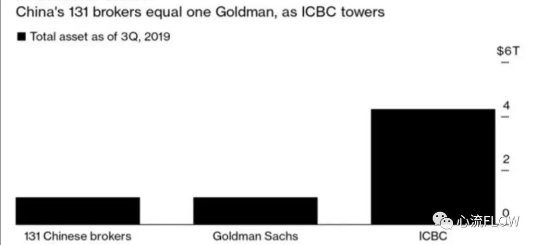 截至2019三季度末,中国131家券商与高盛、工行资产规模对比(资料来源:彭博)