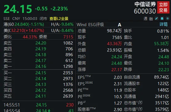 截至今日收盘,中信证券股价报24.15元,A股总市值超3500亿元。