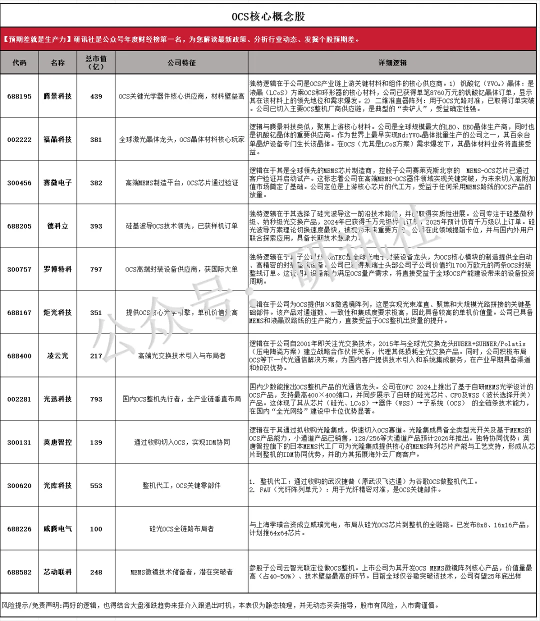 (3)【OCS】标的:腾景科技、炬光科技、光库科技、德科立;