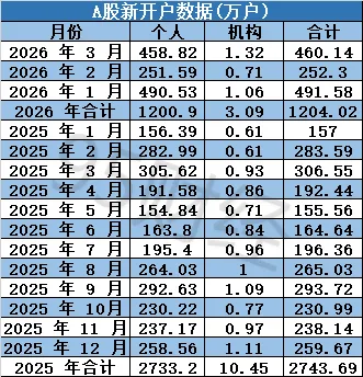 据最新行业统计数据显示,2025年 A 股市场全年新增投资者数量达到 2743.69 万户,较上年同比增长 9.75%,这一数值创下了近四年来的最高纪录。曾经那种 “投资者排队到营业部开户” 的火爆场景,在当下的市场中再度上演。
