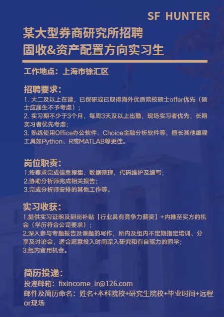 » SF HUNTER | 某大型券商研究所招聘固收&资产配置方向实习生