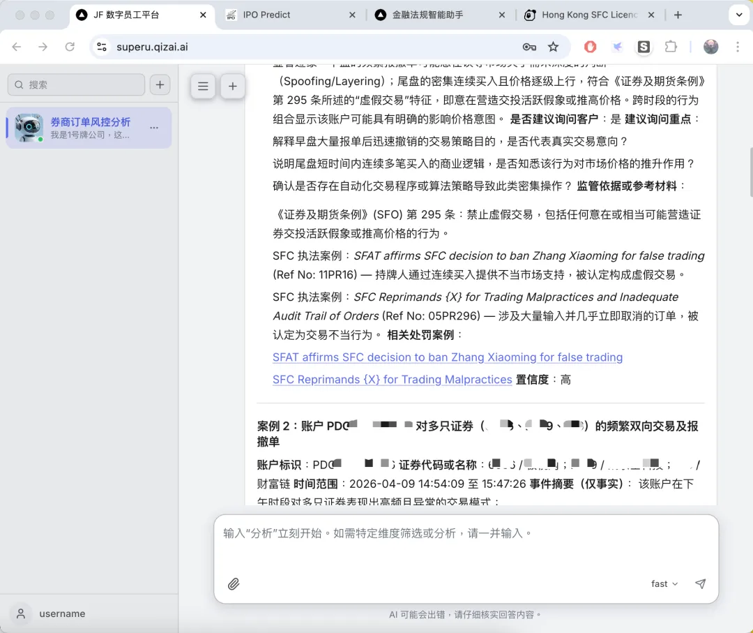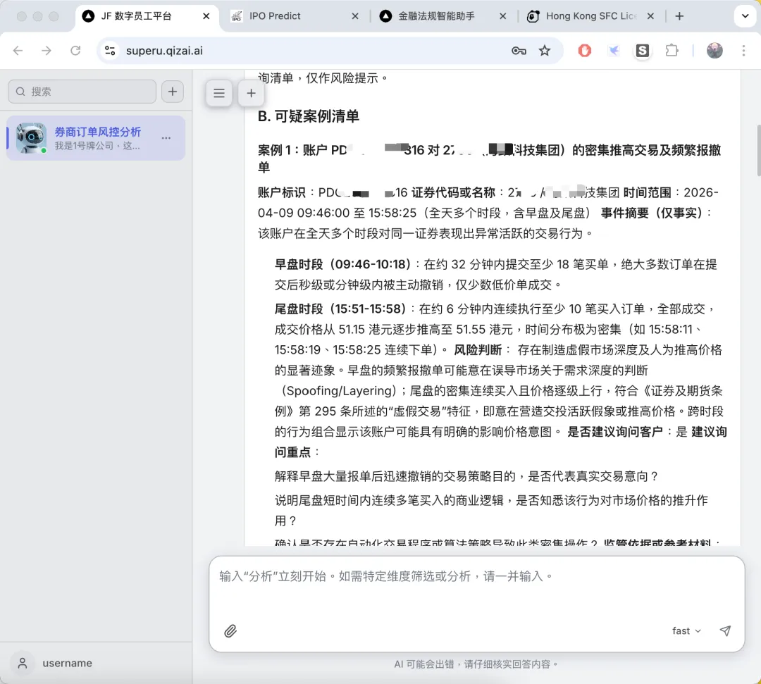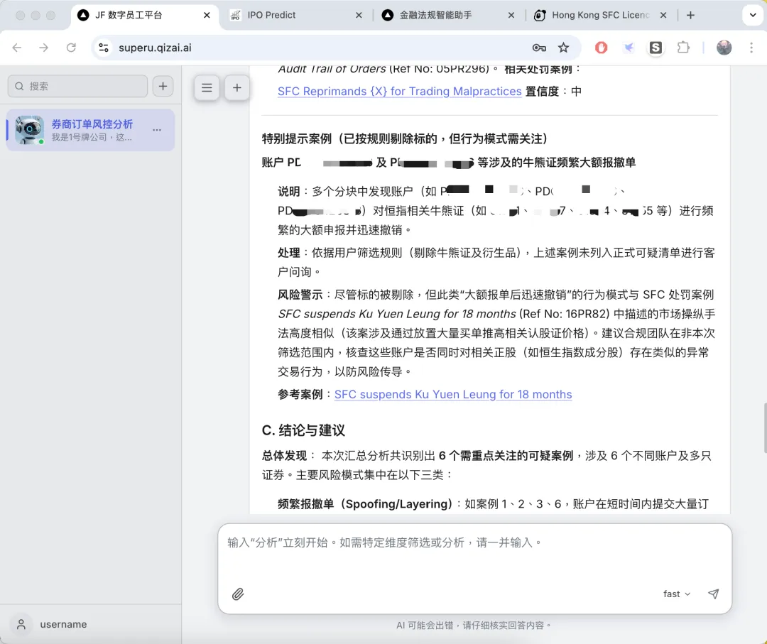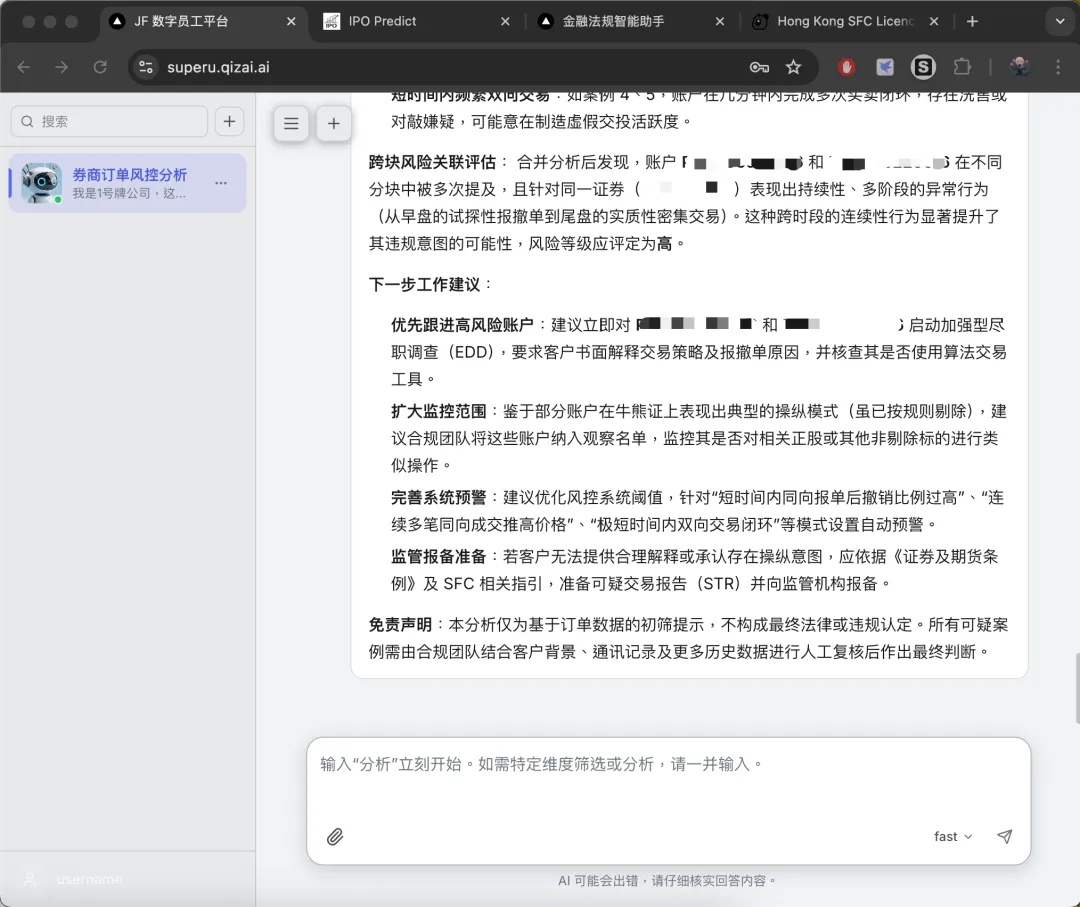 其中可疑交易监控的小工具已经可以互联网试用(网址 superu.qizai.ai),感兴趣的券商朋友可以试下(记得数据脱敏后再上传):和过往的可疑交易监控工具不同,我们并没有预先设置固定的参数(交易单数、交易金额、撤单次数,等等),而是基于合规知识库,让AI员工直接进行筛查和判断。我今天第一次试用可疑交易监控的AI员工,效果如下:⬆️筛查出的每个可疑交易的客户及其订单情况,因为后续可能涉及向客户询问,所以AI也给出了询问函内容⬆️我在提示词中要求剔除牛熊证,结果AI提示某些牛熊证订单也需要关注,并给出了监管处罚案例😨⬆️最后给了总结及后续措施建议,及免责声明🤷♂️⬇️为了保证合规知识库的时效性,我们每天都会进行更新,比如监管的条例、守则、指引、通函、FAQ、新闻等等。题外话:网上的AI生成图频越来越多,看得人直犯腻,反倒越发喜欢手绘插画里那股带着人味儿的拙气。(此句话为AI优化表达)