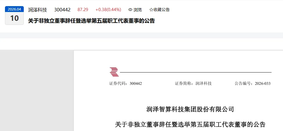 近日,A股算力基础设施龙头企业润泽智算科技集团股份有限公司(股票代码:300442,简称“润泽科技”)发生了一起备受关注的人事变动。公司第五届董事会职工代表董事沈晶玮女士因已到退休年龄,正式递交了书面辞职报告,辞去该职务。接替她出任新一任职工代表董事的,正是公司现任董事会秘书兼财务负责人董磊先生。