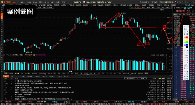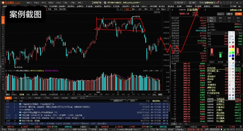 这是一M头,上方两道颈线,第一个4,010点,今天上午最高点是正好打到,再往上呢,大概4,075点,行情要么从这个位置回调震荡,要么可能再往上冲一下,从这个位置再回调震荡,也就这两个区间了。