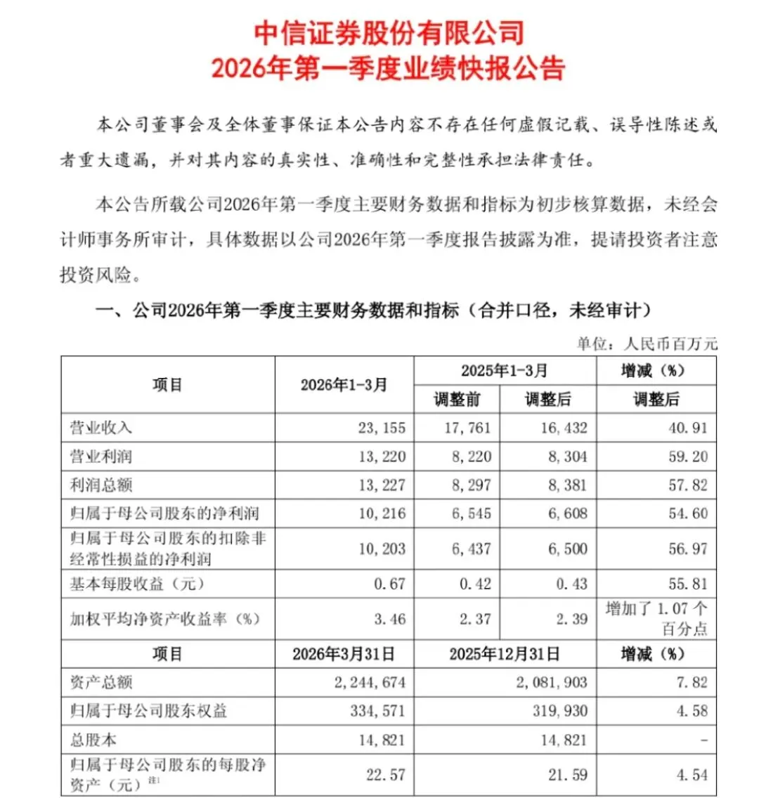 券商龙头一季度业绩快报出来了,归母净利润增长54%,小超预期。