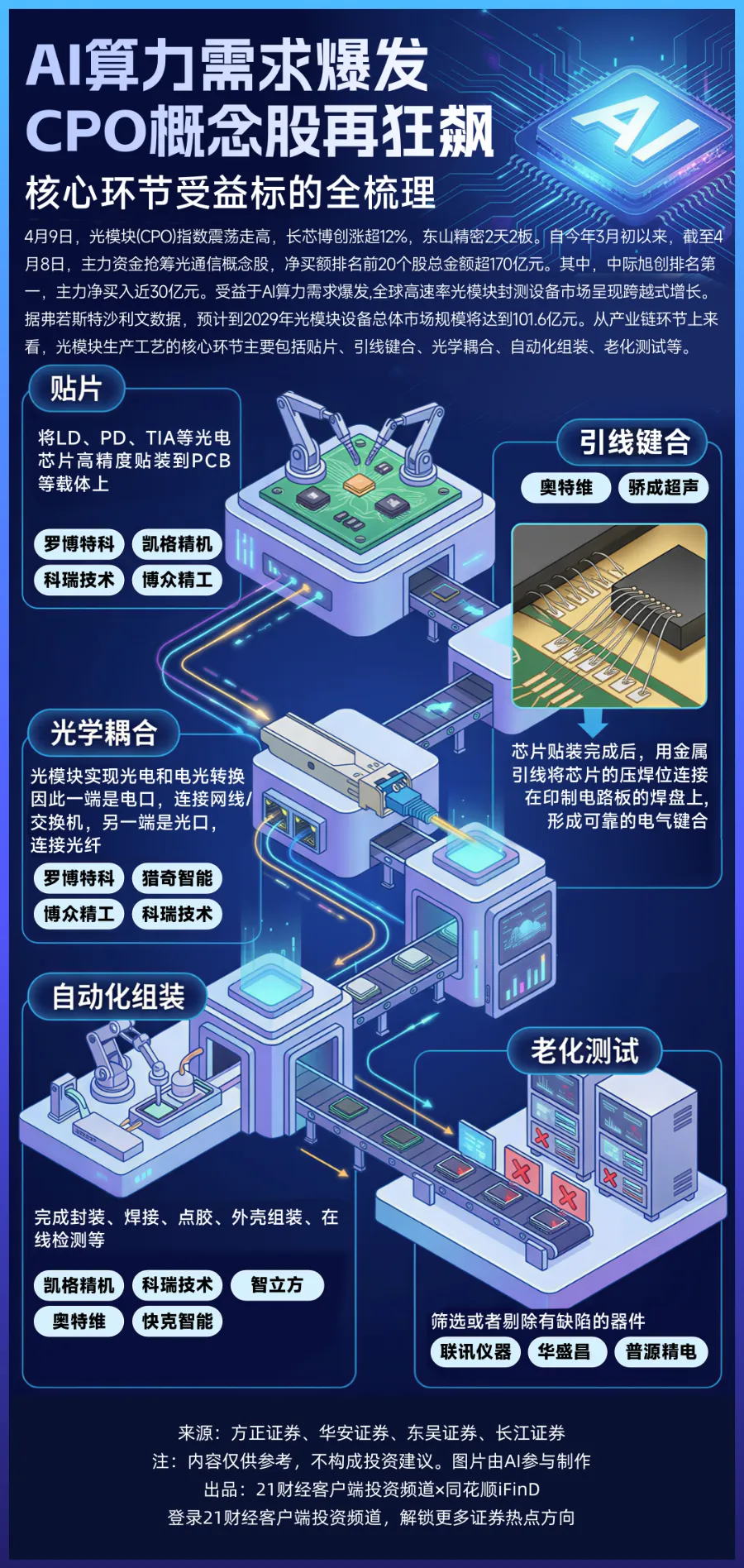 6、标的:科瑞技术(覆盖耦合机、贴片机、AOI、光纤打磨机,价值量占比高(50%-60%))、博众精工、凯格精机、快克智能、罗博特科