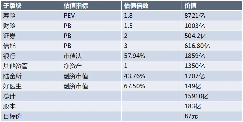 利用分部估值法根据每个业务板块性质分别选取估值指标和对标公司计算价值