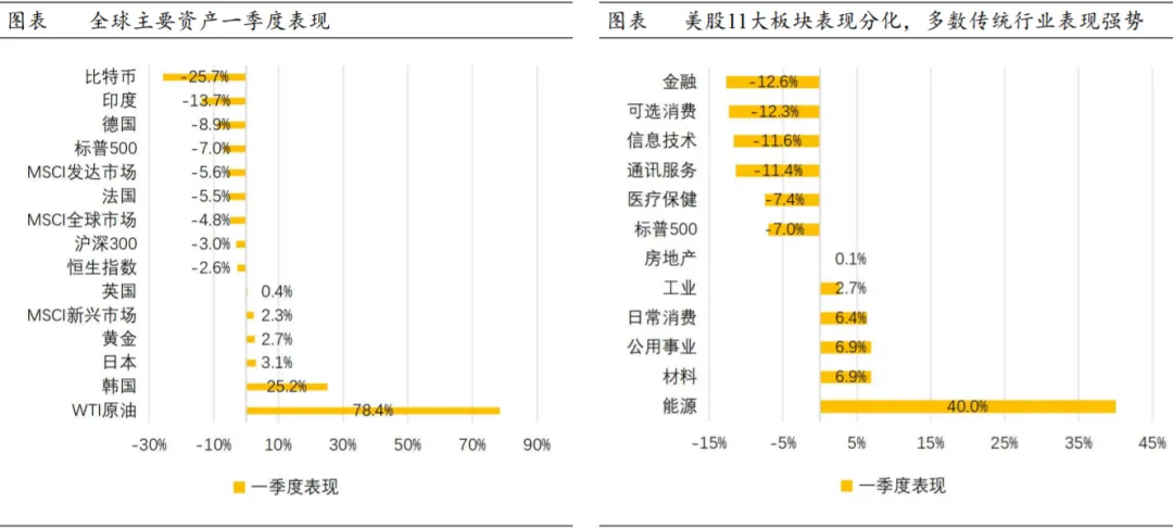 今年1-2月份市场受降息预期影响表现可圈可点,随着2月底美伊战争打响,流动性收紧, 3月全球主要大类资产除了原油突飞猛进之外,其余均出现不同程度回调。 在美股11大板块中,一季度跑赢标普500的有6个,集中于传统行业,均有正收益,风格 上价值优于成长。