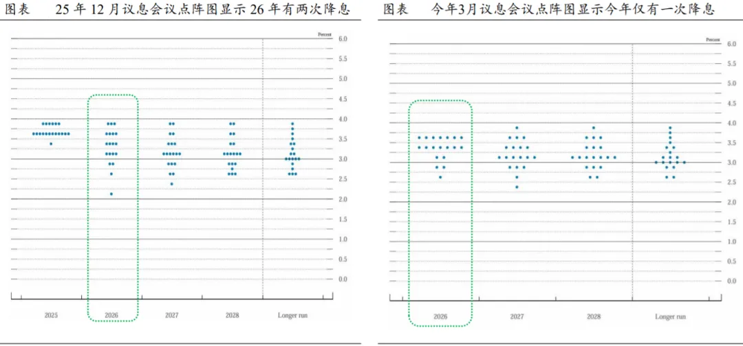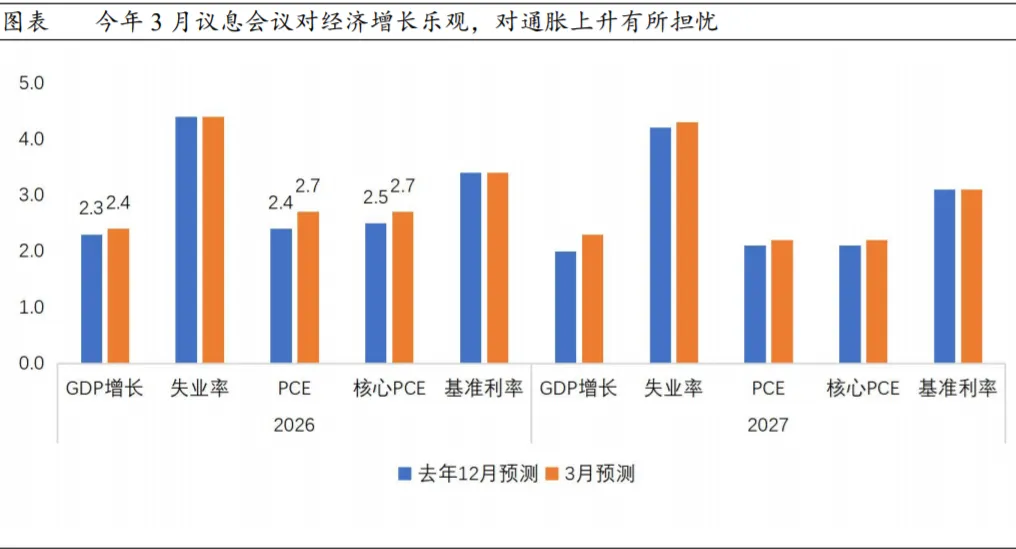 综合3月18日发布的美联储会议纪要、主席鲍威尔举行的新闻发布会及经济预测,有几点 值得特别关注:(1)维持基准利率不变,年内降息一次,相比去年12月降息两次有所降低。 (2)强调中东战争影响不明朗,未来还得看数据。(3)上修GDP增长预测(2.3%上修至2.4%), 同时上修通胀预测,对通胀的担忧重于经济停滞,即更关注通胀上行风险。(4)重申美联储 独立性,主席任期结束后是否继续留任理事仍未决定。总体而言,本次议息会议表述偏鹰, 引发市场波动。