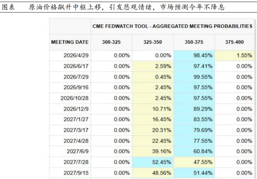 通胀上行预期主要来自于关税与美伊战争引起的原油价格飙升,对降息预期构成压制。 关税对通胀上行的影响,已逐渐明朗而且美联储认为是一次性影响。美伊战争何时结束,以 何种方式结束,目前仍是未知数,但在中期选举的压力之下,我们预计特朗普有意尽快结束 美伊战争,原油飙升所引发的通胀预期也可能是短期的。
