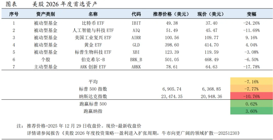 今年我们推荐的资产平均收益-7.16%,跑赢标普500及纳指,未获得绝对收益。我们认为 二季度后半段市场风格将从价值转向科技成长,因此维持2026年首选资产组合做为二季度的 首选,持续看好黄金、工业制造、比特币、科技等类别ETF。同时,建议关注受益于人工智能 对存储芯片巨大需求的韩国综合指数,前瞻估值PE 8.4倍,远期盈利增速131%,具备低估值 高增长的特点,韩国ETF(代码:EWY)。 中期选举是特朗普今年最重要的议程之一,近期特朗普曾多次释放有意尽快结束美伊战 争的言论,右侧交易者待油价回落降息预期重燃再择机入市,现今宜等待见底信号出现。