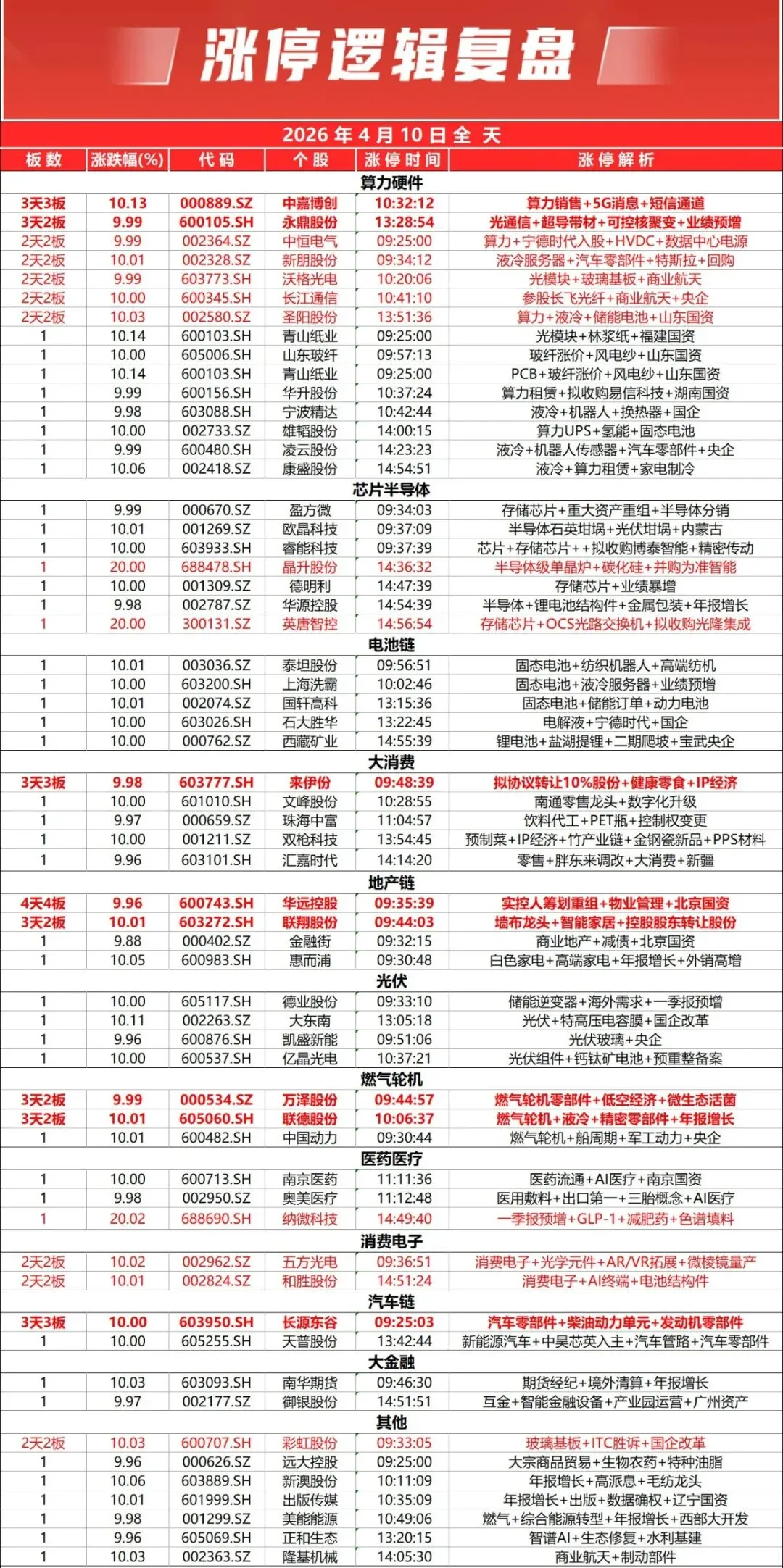 领涨主线二:电池/新能源——多重利好共振。 欣旺达成为特斯拉电池供应商的传闻叠加工信部“反内卷”座谈,锂电池、光伏、储能全面爆发,国轩高科等多股涨停,宁德时代盘中大涨超7%。新能源赛道同时受益于一季报盈利改善预期和能源安全逻辑。