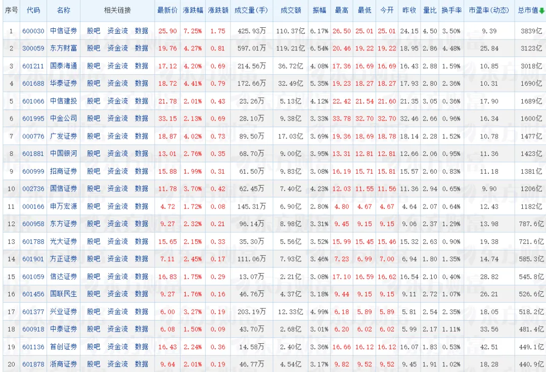 4月10日,券商板块全面翻红。中信证券高开高走,一度逼近涨停。全天收报25.90元/股,较前一交易日24.15元/股上涨7.25%。
