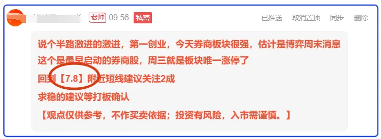 4、短线新增关注了券商方向,收盘刚好就是在【7.8】附近,