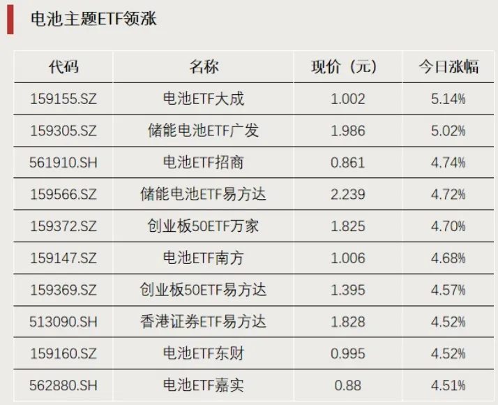 ETF方面,电池ETF大成、储能电池ETF广发涨超5%,电池ETF招商等多只产品涨超4%。