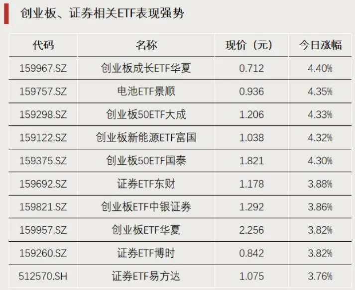 今日,新能源板块与证券板块表现活跃,多只龙头股显著上扬,推动创业板、证券等相关ETF表现强势。