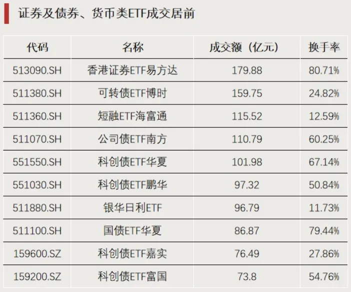 从成交金额来看,今日香港证券ETF易方达成交额排名第一,达179.88亿元。此外,可转债ETF博时、短融ETF海富通等债券、货币类ETF成交金额超过100亿元。