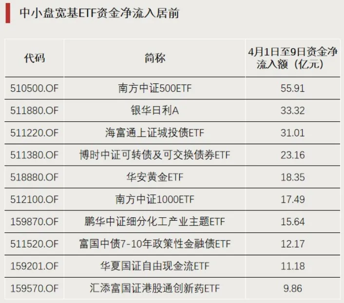 截至4月9日,多只中小盘宽基ETF自4月以来迎来较为显著的资金净流入。其中,南方中证500ETF4月以来净流入额达55.91亿元,在全市场排名第一;南方中证1000ETF净流入额为17.49亿元,排名第六。今年第一季度,这两只中小盘宽基ETF的资金净流出金额分别达814.63亿元、602.23亿元。