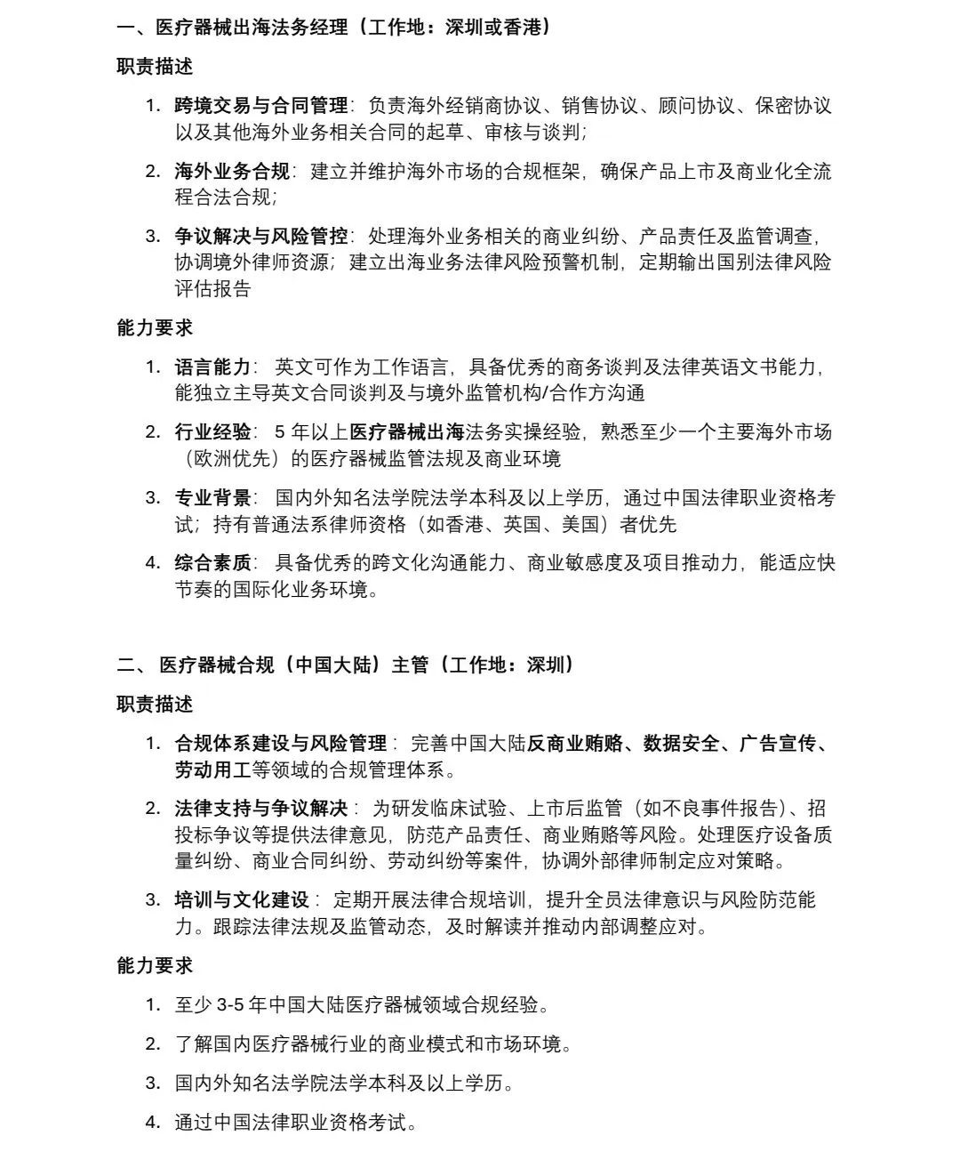 - 招聘 医疗器械出海法务经理(深圳/香港)