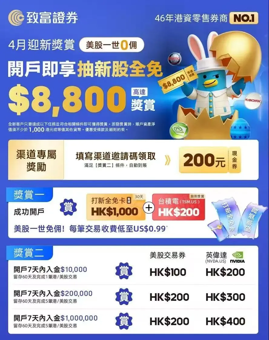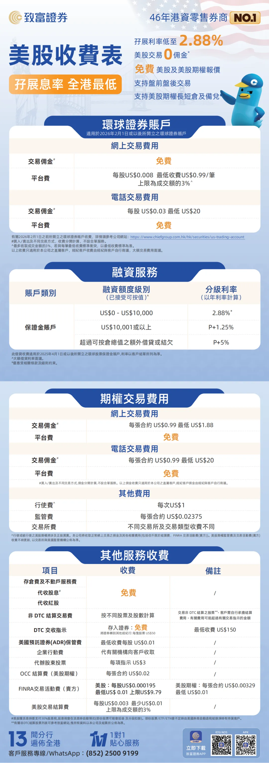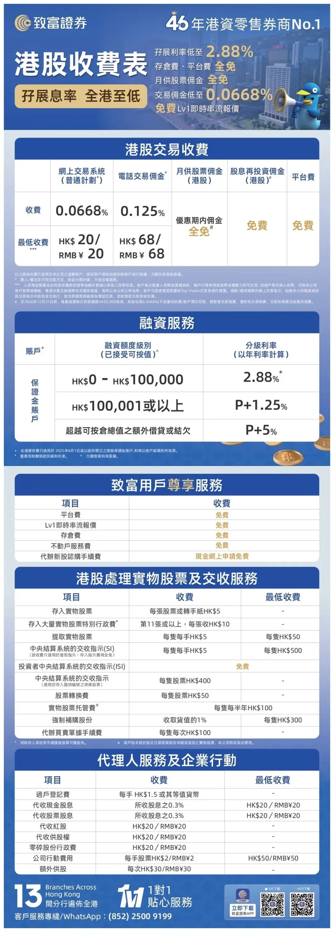 自1979年成立至今,45年穿越周期,经历过多次全球性金融危机依然屹立不倒,也算是“老字号”了。同时,持有香港证监会第1、2、4、5、6、7、9类共7张全牌照,还是内地证监会批准的QFII机构,在全港拥有超过11间实体分行。和复星一样,致富目前不查存量证明、不强制海外身份。只要你有内地身份证,全程手机线上就能搞定,对大家非常友好。https://www.chiefgroup.com.hk/hk/open?rl=ECR&PromoCode=PF7875🎁 入金1万港币,留存60天+交易1次,可享以下福利:5.高达HK$1000 港股打新全免卡打新费用全额减免开户后 7 日内入金 1 万港币,留存 60 天并完成至少 1 笔交易,奖励全部生效,且领取时账户内需有1万港币。建议最好提前准备出入金的境外银行卡再开户,避免错过奖励。如果您还没有境外卡,也可以联系我们协助办理,无需肉身出境也能办理,比如渣打银行、汇丰银行、华侨银行等等。港股佣金为万分之6.68,无平台费;融资利率最低为2.88%;美股免佣金,收取每股$0.008手续费,最低收费$0.99/笔,上限为成交额3%。https://www.chiefgroup.com.hk/hk/open?rl=ECR&PromoCode=PF7875如果你喜欢老牌券商送股票的实在感,致富是个不错的补充。有任何问题,都可以通过下方的联系方式找到我们,直接对接官方客户经理,手把手教学指导,高效解决您的问题。想要获取最全面的信息以及老曾团队工具库,请访问网站 laozeng123.com