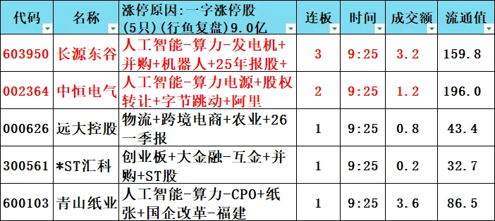 一字涨停股:5只 9亿元