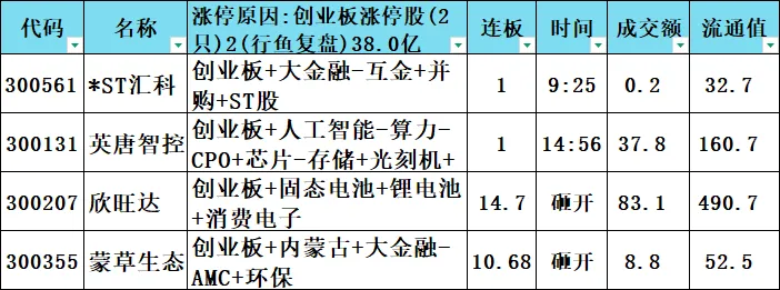 创业板涨停股:2只 38 亿元