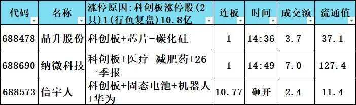 科创板涨停股:2只 10.8亿元