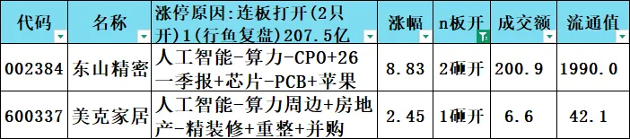 连板股打开:2只207.5亿元