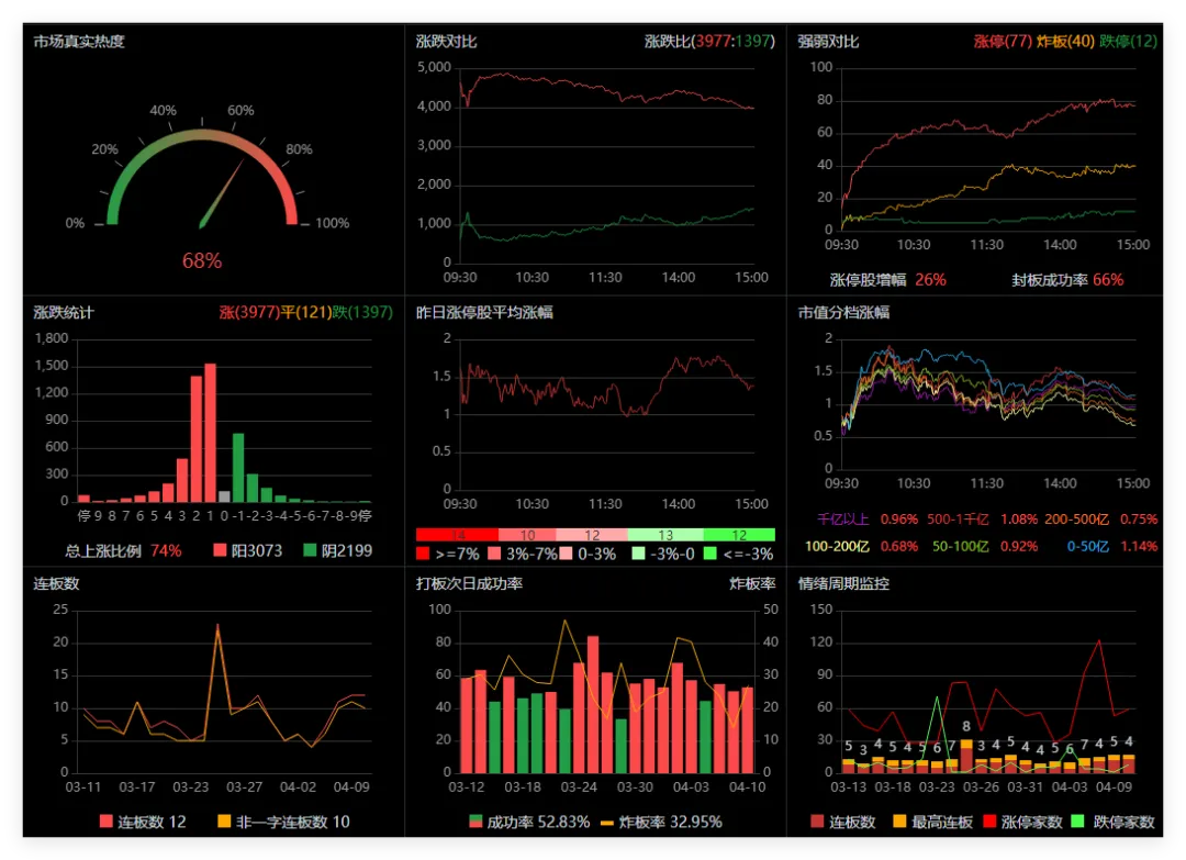 5.情绪指数(包含:热点强度,情绪九宫格,监控池,3大抱团区间涨幅)。