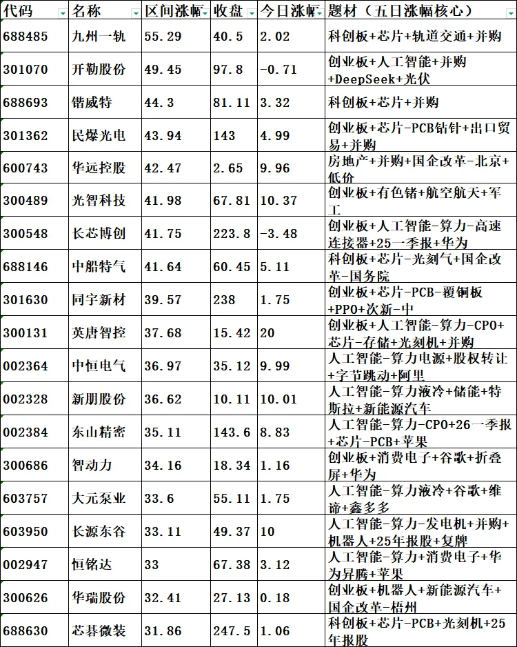 两市a股个股五日区间涨幅前19: