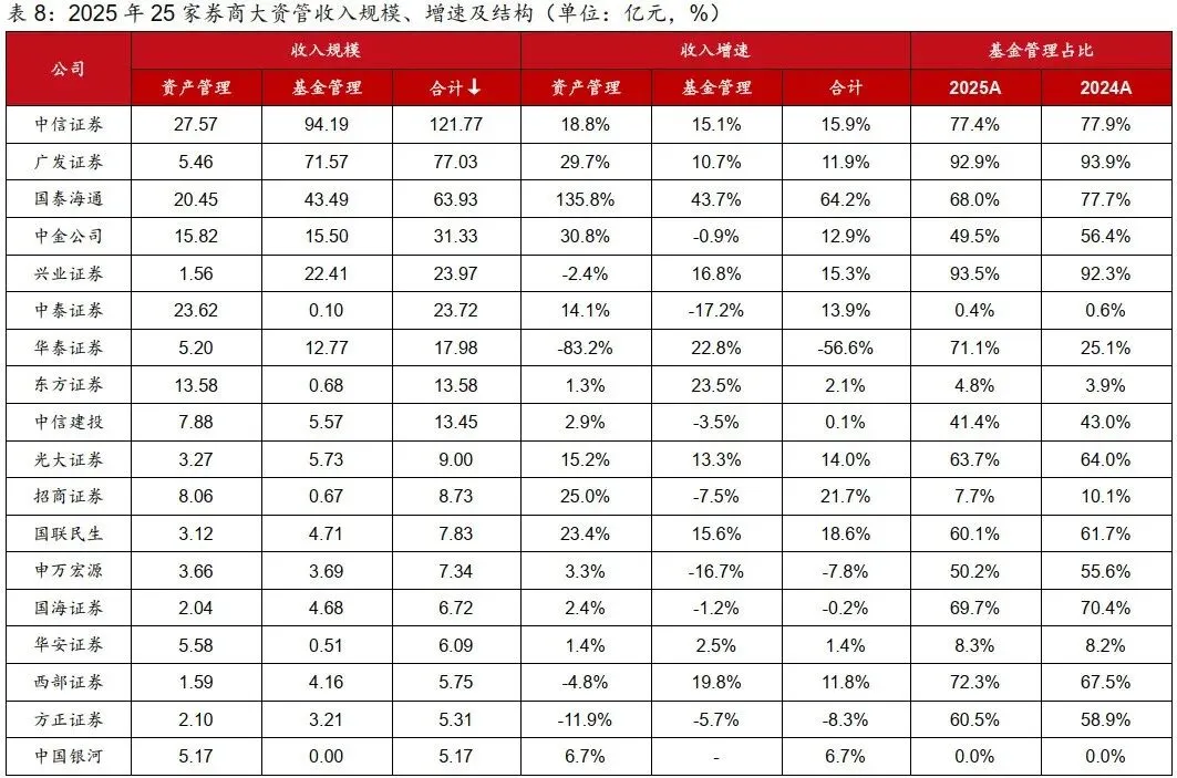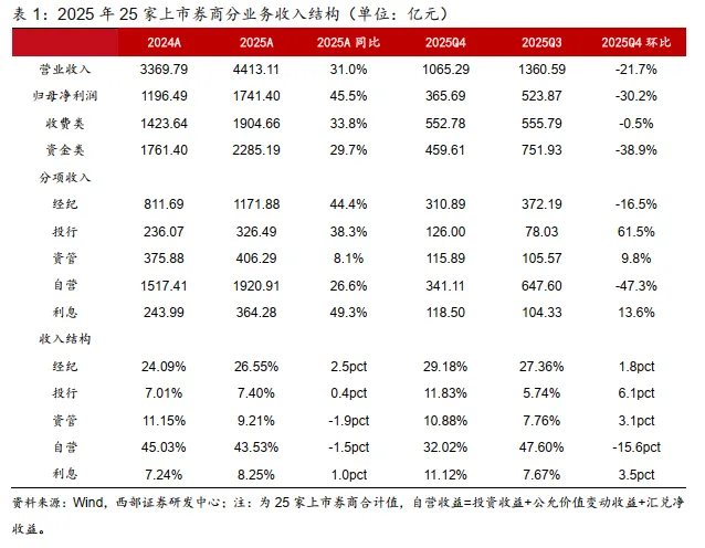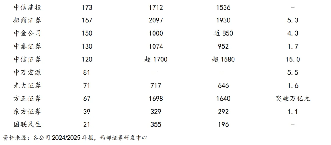 我们统计了2026年4月2日之前发布2025年报的25家券商,对其年报进行详细分析。25家样本券商分别为中信证券、国泰海通、华泰证券、广发证券、中国银河、招商证券、中金公司、申万宏源、中信建投、东方证券、方正证券、光大证券、兴业证券、华安证券、东兴证券、国联民生、信达证券、西部证券、中泰证券、红塔证券、西南证券、首创证券、国海证券、华林证券和中原证券。