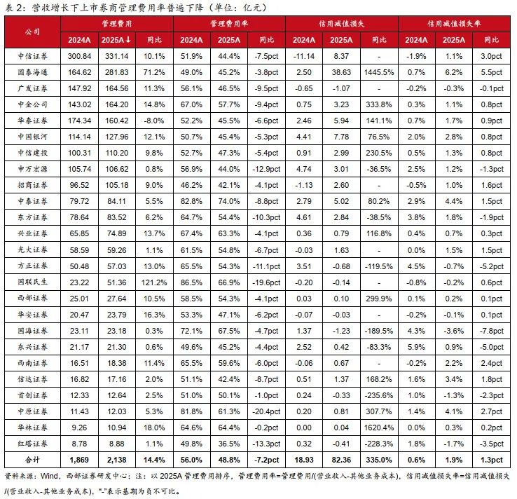 成本端,管理费用率明显下降。25家上市券商2025年合计管理费用同比+14.4%至2138亿元,管理费用率下降7.2个百分点至48.8%;25家上市券商合计计提信用减值损失82.36亿元,同比大幅提升335%,信用减值损失率同比上升1.3pct至1.9%,由于并购重组国泰海通计提信用减值损失38.63亿元,同比大幅增加,另外华泰证券、中国银河、中泰证券等券商信用减值损失规模也有所提升。