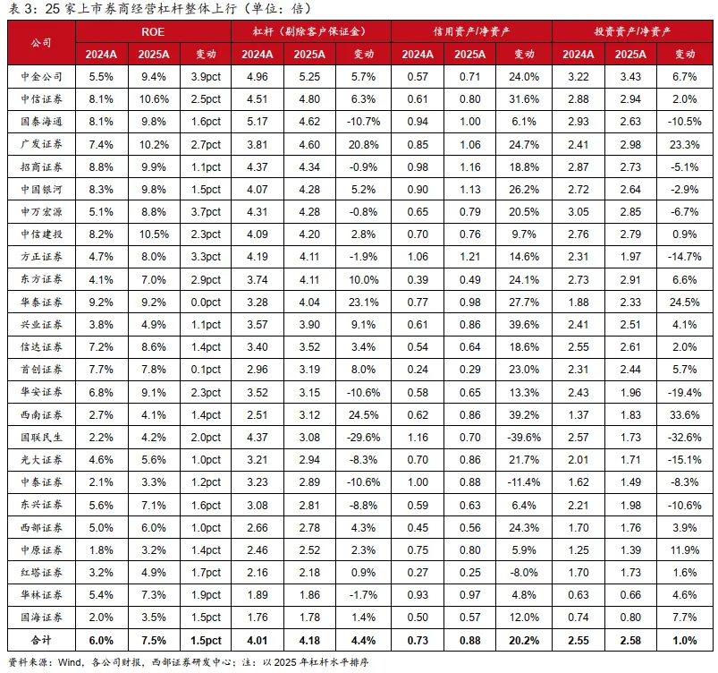 2025 年上市券商经营杠杆整体上行,头部机构加杠杆节奏明显分化。25家上市券商2025年剔除客户资金后的合计经营杠杆较年初上升4.4%至4.18倍,其中信用杠杆和投资杠杆分别较年初+20.2%、+1.0%至0.88、2.58倍,2025年市场成交活跃下大部分券商融出资金规模有所提升。分公司来看,不同券商在用表思路上出现分化,中金公司经营杠杆较年初提升5.7%至5.25倍,超过国泰海通位居上市券商首位,另外广发证券、华泰证券经营杠杆由2024年末的3.81、3.28倍提升至4.6、4.04倍,但也有部分头部券商经营杠杆出现下滑,比如国泰海通受合并影响经营杠杆较年初下降10.7%至4.62倍。