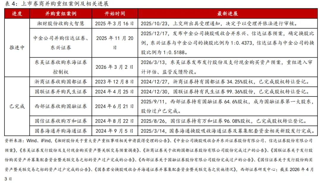 25家券商业绩表现优异,并购重组持续演绎。2025年权益市场上涨,市场交投活跃度提升,经纪、自营明显受益,头部券商同时受益于港股IPO活跃,国际业务成为重要增长极。整体来看,头部券商业绩增长明显,25家券商业绩均实现正增。国泰海通扣除非经常性损益归母净利润同比增长71.9%,同时中金公司、申万宏源等券商业绩实现大幅增长,25家券商中归母净利润排名前五的券商归母净利润占比由2024年的58.9%小幅降至2025年的57.7%。自 2023 年 11 月证监会提出 “支持头部券商通过并购重组做优做强” 以来,行业先后涌现出国联证券收购民生证券、国泰君安整合海通证券等一系列标志性并购重组案例,行业整合态势显著。2025年券商并购整体节奏更趋稳健有序,以中金公司为代表的头部券商仍持续推进并购布局,积极响应建设国际一流投资银行的战略导向。