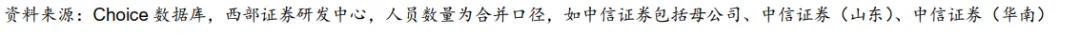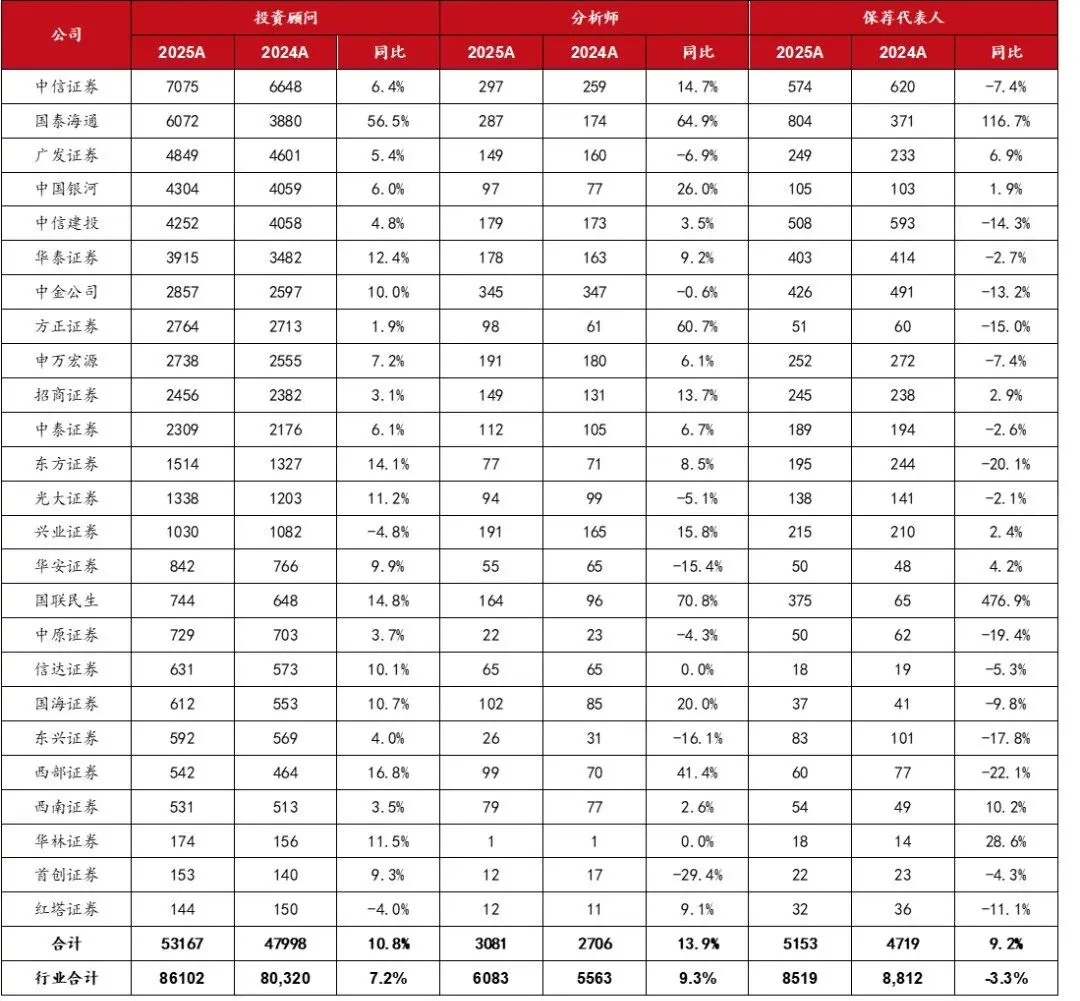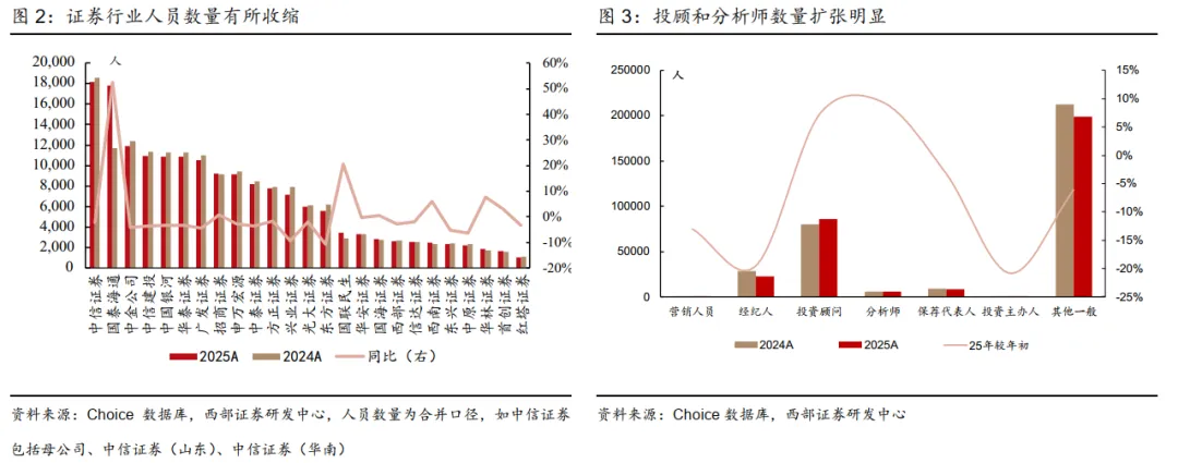 证券行业从业人员队伍有所收缩。截至2025年末证券行业从业人员总数同比-3.9%至32.34万人,主要源自证券经纪人数量的减少;25家上市券商合计员工总数在国泰海通、国联民生等完成合并影响下同比+1.1%至17万人,除并购整合券商和部分中小券商外,样本中25家券商从业人员数量均递减,中金公司、广发证券、东方证券、兴业证券人员队伍明显缩减,较年初分别-4.3%、-4.4%、-10.8%、-9.3%至11,866、10,492、5,537、7,161人。