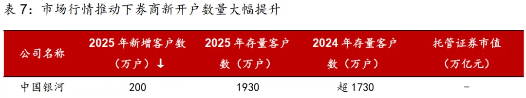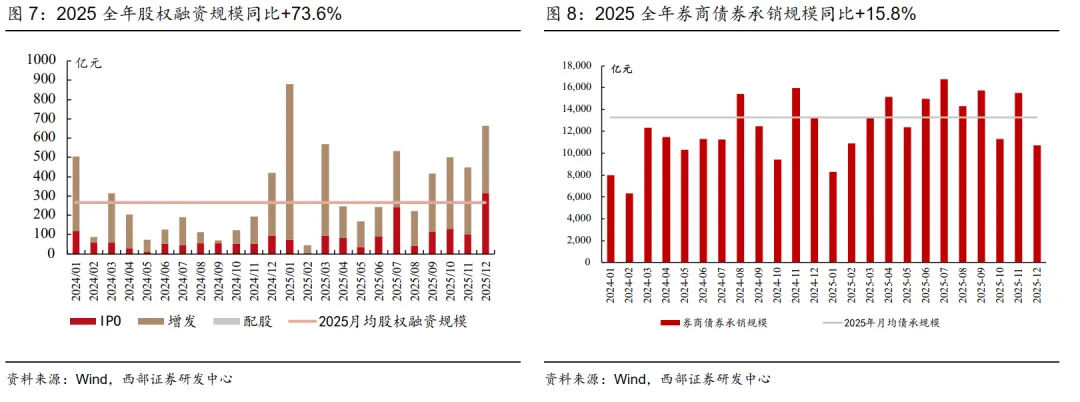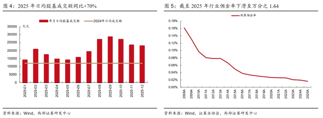 市场成交活跃驱动经纪净收入大幅提升。2025年两市股基成交额为499.1万亿元,日均股基成交额为20,538亿元,同比+70%;其中三季度日均股基成交额为24,903亿元,成交额大幅增长,同比+209.5%,环比+67.4%。2025年股+混新发基金5,856亿份,同比+82.9%。截至2025年末,测算证券行业股基佣金率已下降至万分之1.64,全年市场成交维持高位驱动券商经纪净收入大幅提升,25家上市券商2025年合计实现经纪净收入1171.88亿元,同比+44.4%。