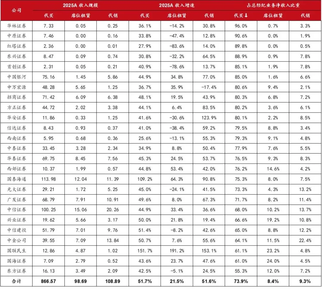 市场成交活跃下,代买代销业务收入占比提升。2025年25家上市券商合计代买、席位租赁和代销净收入同比分别+51.7%、+21.5%、+51.6%至866.57亿元、98.69亿元、108.89亿元。2025年资本市场交投活跃度明显提升,全年权益市场交易量高增,在市场成交放量带动下,券商代理买卖证券业务收入显著增长,同时机构投资者交易需求提升也带动席位租赁收入实现增长。另一方面,权益市场回暖叠加居民资产配置需求提升,权益型基金新发份额同比大幅增长,券商代销业务收入快速提升,在经纪业务中的收入占比提高。从收入结构看,代买、席位租赁和代销净收入占经纪净收入的比重分别同比变化+3.6、-1.6、+0.4个百分点至73.9%、8.4%、9.3%,代买和代销业务占比稳步提升。