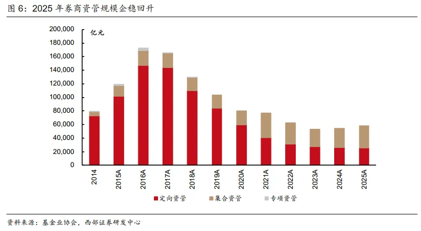 2025年券商资管行业规模已呈现回升趋势。截至2025年末,证券行业资管总规模为64,400亿元,较2024年末增长5.6%,已连续两年同比回升,其中定向资管、集合资管规模分别为25,162、32,808亿元,较2024年底分别-2.1%、+13.3%。资管新规及后续相关政策实施以来,通道类定向资管规模持续压降,当前压降幅度已趋于尾声,集合资管规模连续两年恢复正增,当前在资管总规模中的占比已过半,券商资管基本完成从通道业务向主动管理的转型。券商资管规模的持续回升表征资管新规对该项业务的影响已基本消退,券商集合规模逐步扩张以及公募化趋势下,投研能力、主动管理能力对券商资管业务的开展变得更为重要。