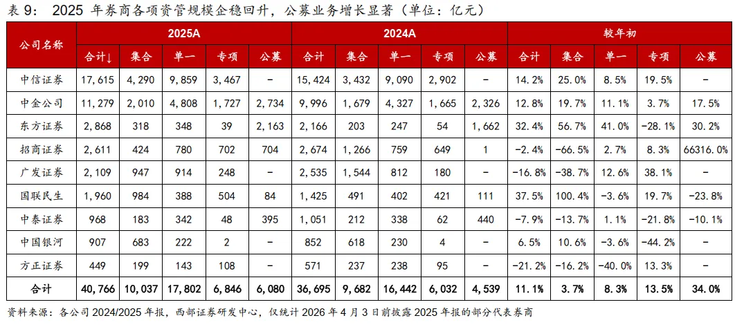 各项资管规模均实现企稳回升。以披露资管数据的样本券商为例,2025年样本券商资管规模合计较年初+11.1%至40,766亿元,其中集合、单一、专项、公募资管规模分别较年初+3.7%、+8.3%、+13.5%、+34%至10,037、17,802、6,846、6,080亿元,各项资管规模有所扩张。分公司来看,截至2025年末,东方证券、国联民生集合资管规模分别为318、984亿元,较年初增长56.7%、100.4%;招商证券2024年通过招商资管正式获批开展公募基金管理业务,2025年加大在公募资管业务上的发力,公募资管净收入在券商资管业务净收入中的占比达53.1%,是资管业务净收入同比增长的主要推动因素。预计未来不同券商资管的经营模式或各有特色,以主动管理为特色的集合资管以及协同投行的专项资管规模或持续提升。