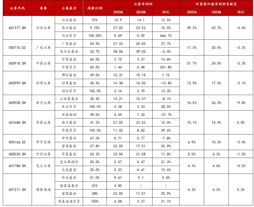 费率改革压缩短期利润空间,但规模扩张与权益市场回暖推动公募基金整体盈利稳步增长。2025年权益型公募基金份额累计新发同比增长82.9%,非货币基金规模同比增长21.2%至22.7万亿元,ETF资产净值为6.02 万亿元,同比+61.6%。在此背景下,券商参控股公募基金公司的盈利表现呈现一定分化。广发基金、富国基金、南方基金2025年净利润同比分别增长37.7%、25.9%、15%,达到27.53亿元、22.05亿元、27.05亿元;相对而言,华泰柏瑞、招商基金净利润同比分别下降37.7%、12.8%,至4.55亿元和14.38亿元。当前公募基金费改已经完成,公募基金盈利表现受产品结构、市场表现等多重因素影响,整体看参控股公募基金仍为部分券商重要的利润来源。