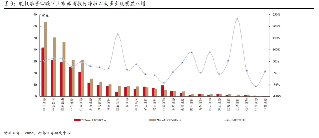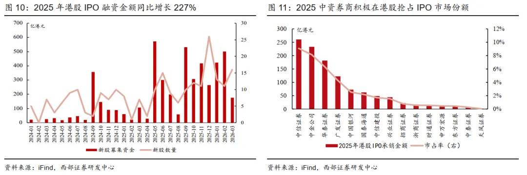 国际投行业务成为头部券商投行业绩的重要增长点。此外,2024年起港股支持IPO 政策陆续出台,香港IPO市场在2025年展现出强劲增长节奏,全年融资额达到2,867亿港元,同比大幅增长227%。受益于港股IPO的复苏,头部券商在境外投行业务方面表现亮眼,其中中信证券、中金公司、华泰证券分别位居港股IPO承销前三名,市场份额分别达9.08%、8.13%和6.33%。在2026年港股IPO市场预计延续活跃的背景下,境外业务有望为投行业务带来增量。