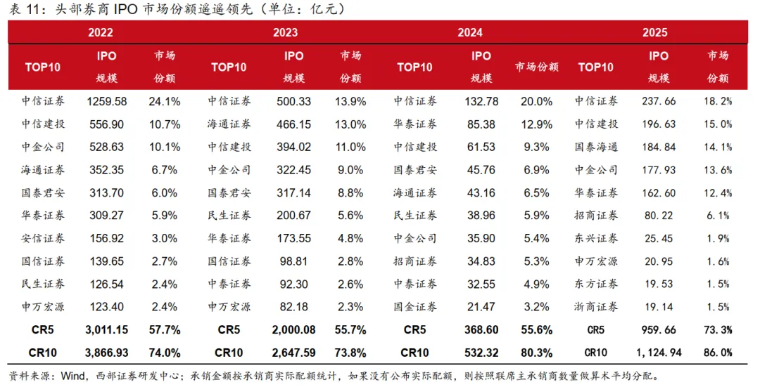 行业马太效应加速强化,预计未来行业格局将进一步走向集中。2025全年IPO规模前三名为中信证券、中信建投、国泰海通,发行规模分别为237.66、196.63、184.84亿元,对应市占率为18.2%、15.0%和14.1%,行业CR5为73.3%,较24年大幅增长17.7pct,行业CR10较24年+5.7pct至86%,马太效应进一步强化。2025年6月证监会推出科创板“1+6”政策举措,重启未盈利企业适用科创板第五套标准上市;2026年2月沪深北交易所优化再融资制度,2026年关于创业板的深化改革和再融资制度的优化将进一步落实。在监管鼓励建设国际一流投行的背景下,具备优质项目资源、专业定价能力和完善风控体系的头部投行机构,或将进一步扩大市场份额,预计投行格局将进一步走向集中。