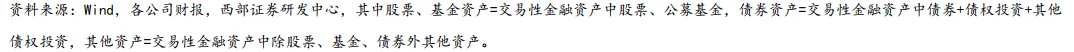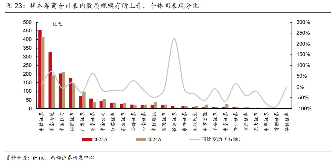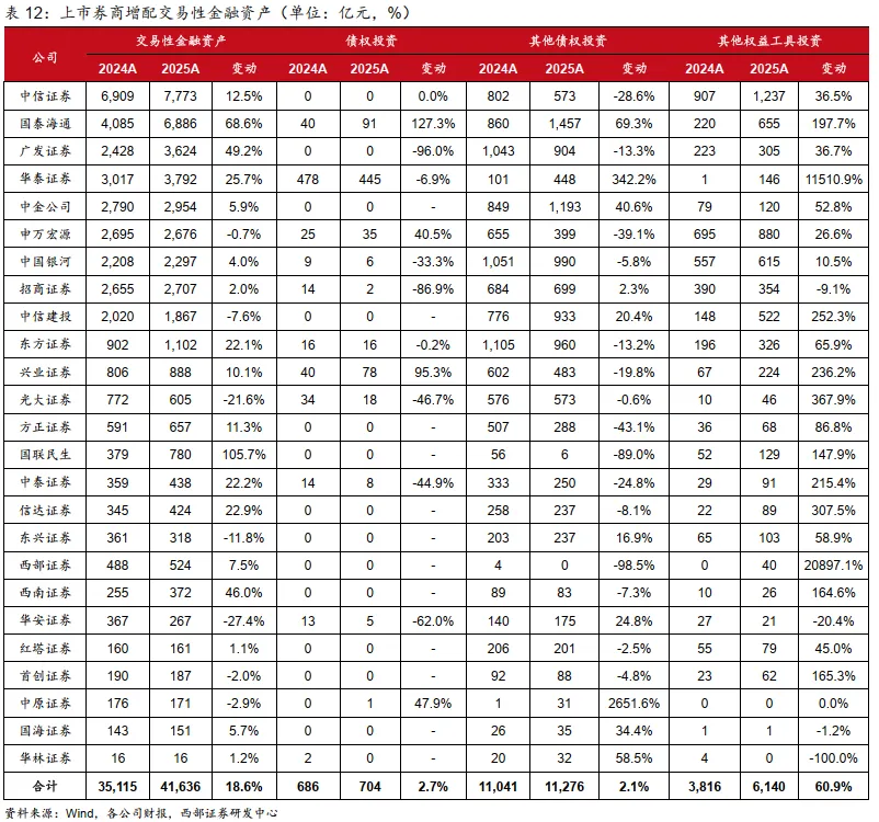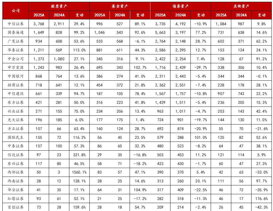 交易性金融资产和其他权益工具投资为2025年券商主要的增配方向。2025年沪深300、创业板指分别+17.7%、+49.6%,中债企业债总全价指数累计下跌1.9%。2025年,25家上市券商金融资产合计规模较2024年末提升18%至59,758亿元,资产负债表延续扩张。从会计科目的角度看,截至2025年末,25家上市券商交易性金融资产、债权投资、其他债权投资、其他权益工具投资合计规模分别较2024年末+18.6%、+2.7%、+2.1%、+60.9%;华泰证券、中信建投、光大证券明显增加其他权益工具投资规模,以获取相应的股息收入。将金融资产进行重分类,25家上市券商股票、基金、债券、其他资产合计规模分别较2024年末+44.9%、+43.5%、+5.3%、+19.3%,权益市场走高下股票资产成为主要扩容方向,占金融资产比重较年初提升4.4pct至23.9%。