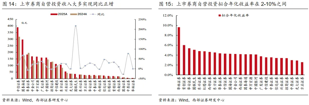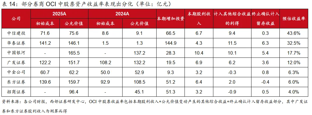 券商投资收入同比大多实现正增。2025年权益市场大幅上行,债券市场有所回调,券商的自营投资收益大多实现正增,广发证券、申万宏源投资收入分别同比增长37.4%、26.5%至159.37、166.63亿元,但招商证券投资收入同比下降2.5%。从投资收益率来看,25家样本券商投资收益率在2%-10%之间,均值为4.3%;其中,华林证券、首创证券年化收益率排名行业前列,分别为9.6%和6%。在2024年高股息表现较好的高基数下,2025年头部券商其他权益工具投资中股票资产收益率表现出一定分化,中信建投、华泰证券OCI中股票收益率表现优异,分别为43.6%、32.5%,招商证券OCI股票收益率相对较低。
