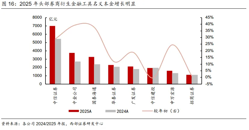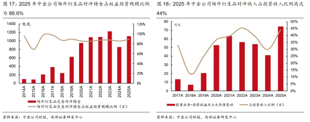 2025年头部券商衍生品业务规模增长明显。我们以券商非套期保值权益型衍生金融工具名义本金规模来衡量场外衍生品业务规模,2025年8家场外衍生品一级交易商场外衍生品规模大多有所增加,截至2025年末,中信证券、中金公司、国泰海通、华泰证券、广发证券、中信建投、申万宏源、招商证券非套期保值权益型衍生金融工具名义本金分别为6977、3755、3256、2295、2116、1922、1604和1102亿元,较年初分别+28.9%、+39.3%、+37.6%、+12%、+18.8%、-0.4%、+24.5%、+0.9%。中金公司2025年其场外衍生品产生的股票资产对冲持仓占权益投资规模的比重同比+3.3pct至88.6%,对应贡献收入占投资收入比例高达44%,较前两年有明显提升。2026年1月证监会对《衍生品交易监督管理办法》公开征求意见,“十五五”规划中提出“稳步发展期货、衍生品和资产证券化”, 尽管当前券商权益衍生品业务的名义本金仍处于总额控制阶段,但中长期来看衍生品市场将持续健全。