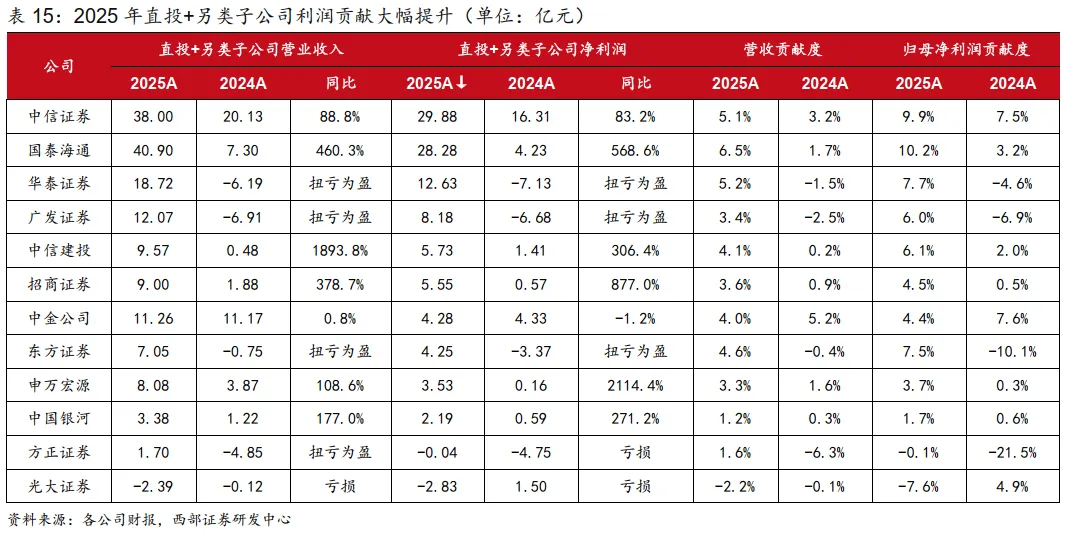 大多数券商直投+另类子公司业绩扭亏或大幅正增,投行资本化趋势显著。2025年一级股权市场有所回暖,整体来看多数头部券商直投和另类子公司同比有明显增长,统计范围内多家券商直投和另类子公司业绩扭亏为盈,同时对集团归母净利润贡献也明显上升。其中,广发证券、华泰证券、东方证券2025年直投+另类子公司净利润扭亏为盈且对公司利润贡献分别高达6.0%、7.7%、7.5%,相比24年业绩有明显好转;中信证券、国泰海通直投+另类子公司归母净利润贡献度同比分别+2.4pct、+7pct至9.9%、10.2%,业绩贡献占比显著提高。在一级市场发行常态化下,投行资本化有望纵深发展。