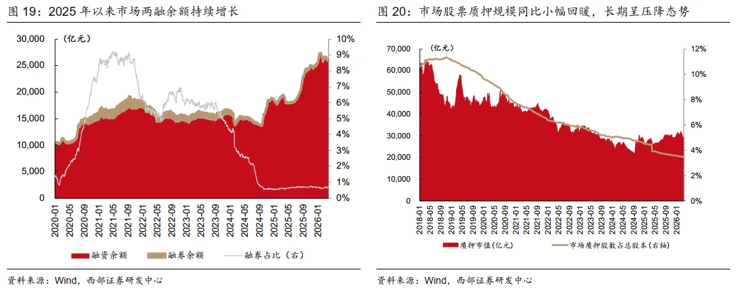 2025年市场活跃拉动两融余额同比增长。924以来市场回暖拉动两融规模一路上行,截至2025年末市场两融余额达2.54万亿元,环比25H1 +37%,较24年末+36%,其中融资余额、融券余额分别较24年末+36%、+58%至2.52、0.02万亿元,融券占比较2024年末上升0.09pct至0.65%;2024年7月,证监会提出暂停转融券,市场融券余额持续处于低位。股票质押规模整体处于压降趋势,当前受市场行情影响有所回暖,截至2025年末,全市场质押股数共计2926亿股,质押市值为2.97万亿元,质押市值较2024年末增长5.9%。